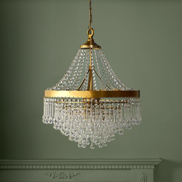 Shakespeare's Juliet was a Capulet. We thought long and hard about how to make this beautiful chandelier elegant, without tipping over the top. We have deliberately kept the central brass belt plain to allow all the glass to do the talking. The shape, we feel, is perfect, and the drops and beads of glass make the light sing. Juliet, we hope, would approve.