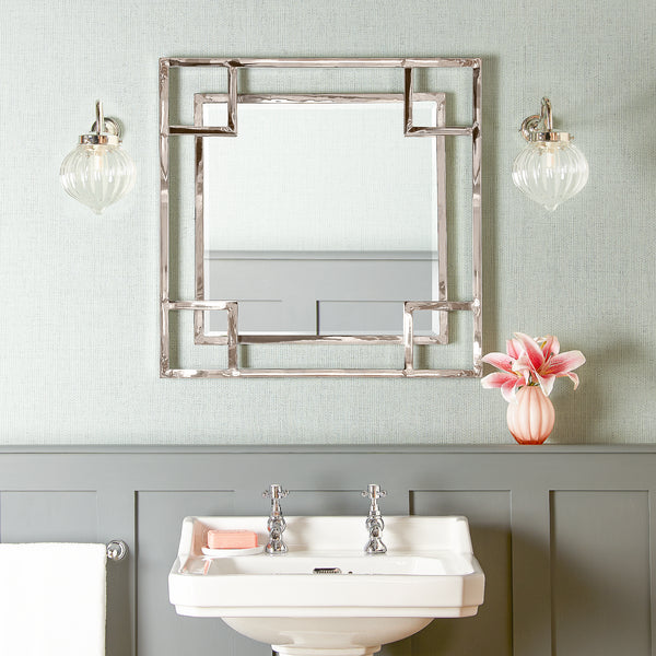 Our Daffings mirror has a slick contemporary and geometric feel to it. Square within squares within squares. In a polished stainless steel finish. A real head turner.