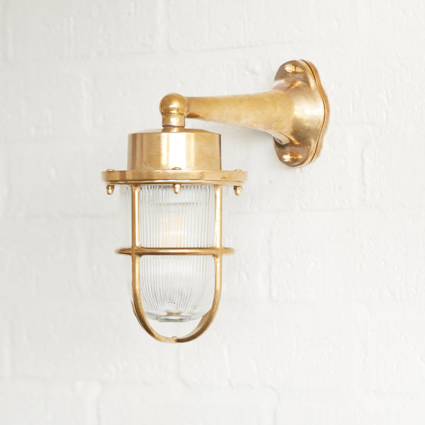 A strong purposeful wall light, with an elegant oval arm, and prismatic glass to cast a more diffused light. As at home on the high seas as a bathroom in Shoreditch. Please note that the brass, being unlacquered, will naturally age, lose its shine and develop a more muted patina.